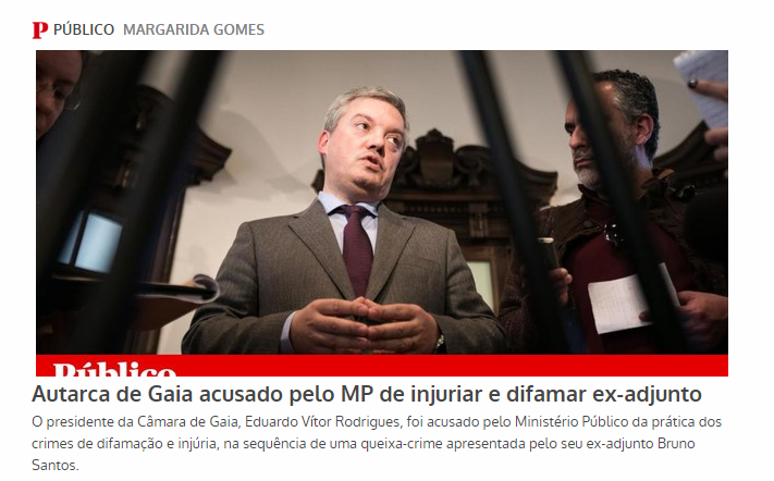 O autarca socialista Eduardo Vítor Rodrigues, que preside à Câmara de Vila Nova de Gaia, foi condenado nesta quarta-feira pelo Tribunal de Gaia a 90 dias de multa, a dez euros por dia, pela prática dos crimes de difamação e injúria, na sequência de uma queixa-crime que o seu ex-adjunto Bruno Santos apresentou no Ministério Público (MP), em 2016. O presidente de Câmara de Gaia terá também de pagar ao seu antigo adjunto uma indemnização de 1200 euros, apurou o PÚBLICO.